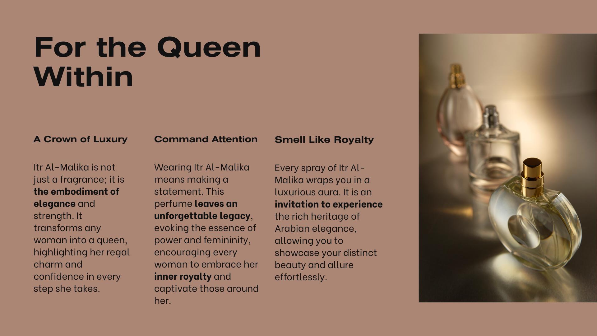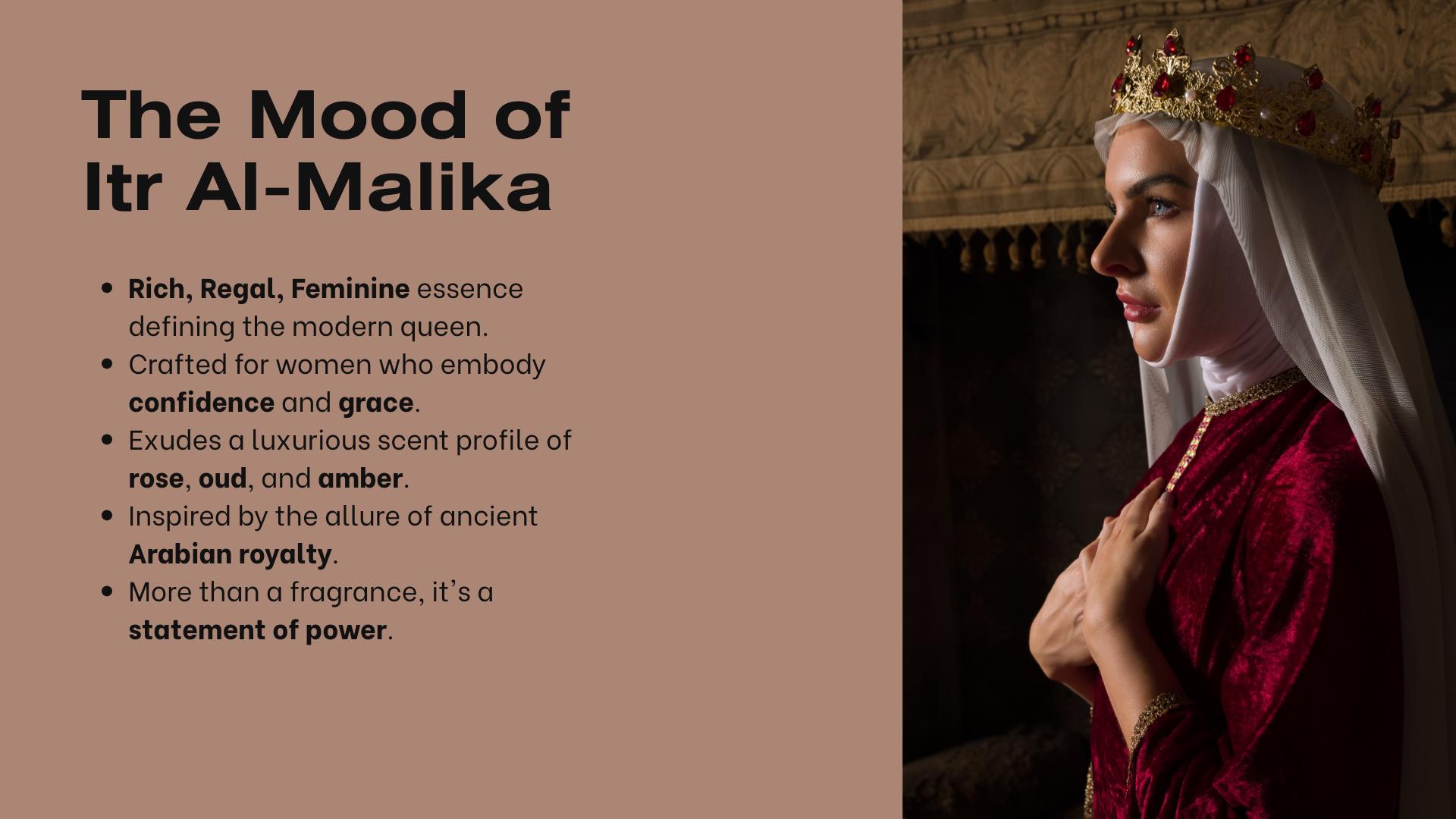 Itr Al-Malika, meaning “Perfume of the Queen” in Arabic, is a fragrance steeped in opulence, tradition, and the majestic spirit of Arabian heritage. Crafted for the woman who carries herself like royalty, this scent is an ode to timeless elegance, inner strength, and radiant femininity.
