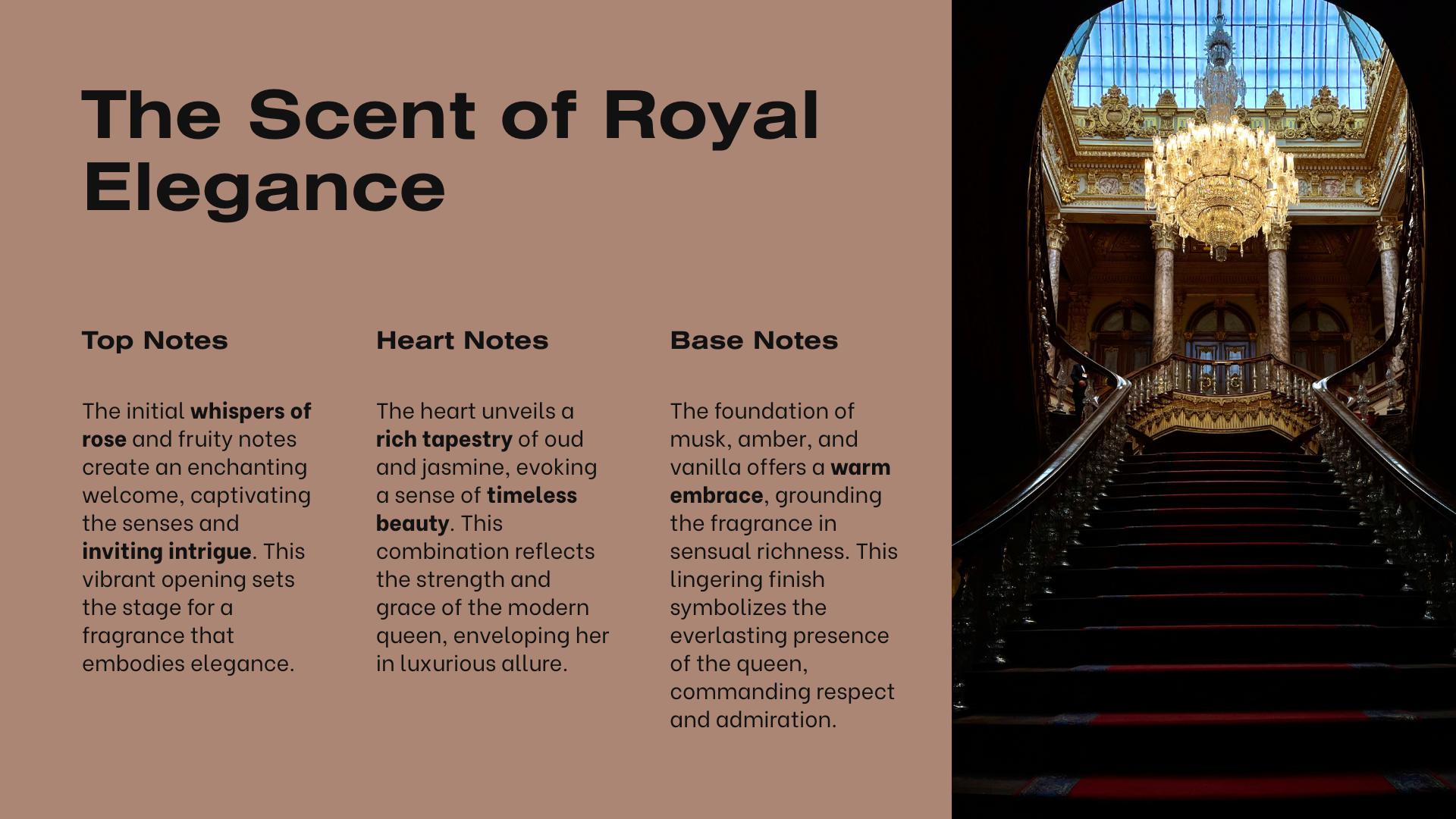 It opens with the lush, romantic scent of rose, laced with sweet, fruity notes that hint at hidden treasures. The heart unveils a sensual blend of oud and jasmine, capturing the soul of the Middle East — smoky, floral, and deeply alluring. Finally, the base reveals a rich, warm tapestry of musk, amber, and vanilla, wrapping the wearer in a golden aura that lingers like a queen’s legacy.