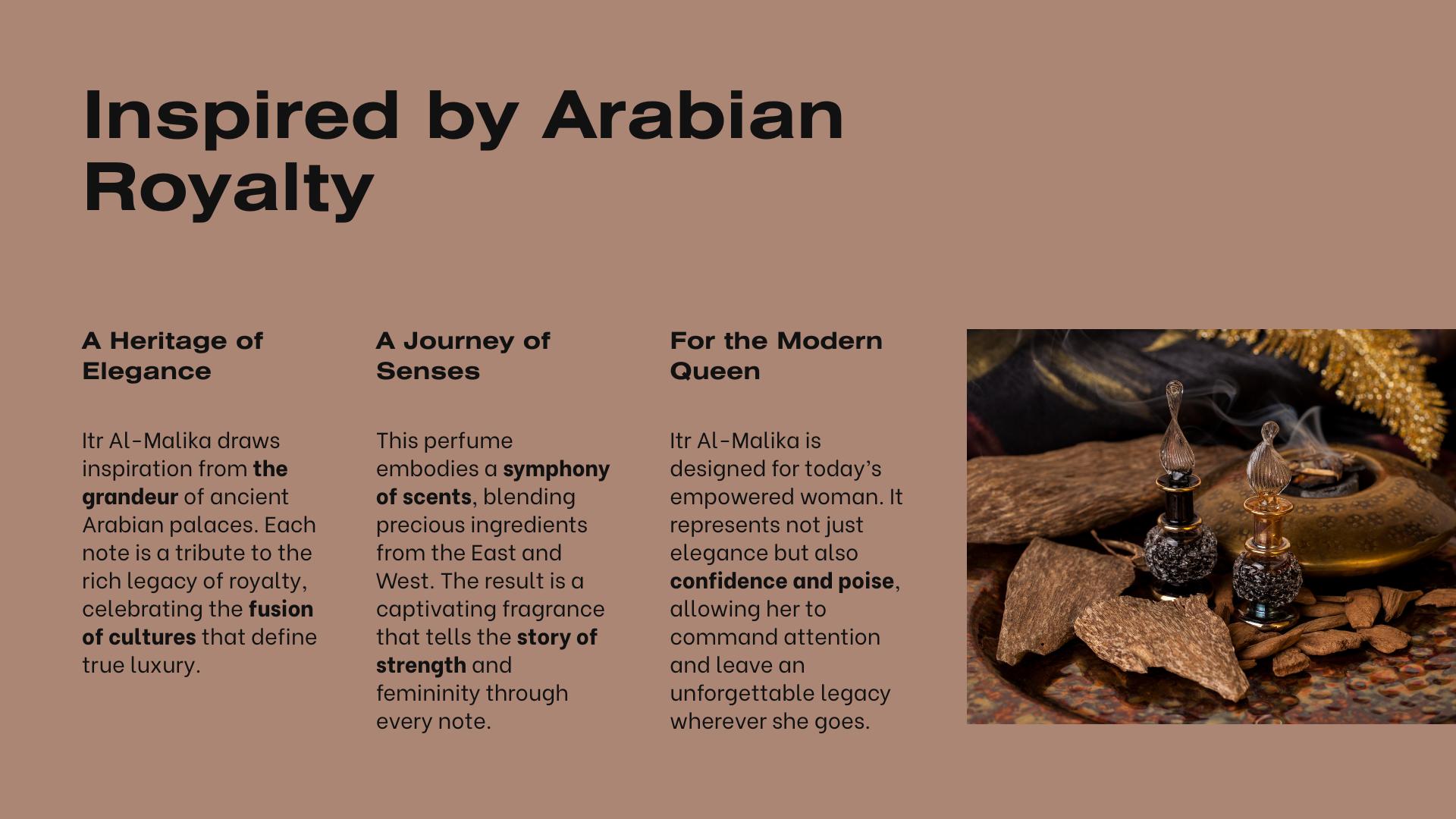Inspired by the grandeur of Arabian queens and the ancient art of perfumery in royal courts, Itr Al-Malika was created as a modern tribute to feminine majesty. Rooted in tradition yet elevated by contemporary elegance, this scent weaves together the sacred ingredients of Middle Eastern perfumery — from the spiritual depth of oud to the romantic heart of rose — to craft an experience that is both regal and personal. It is not just a perfume; it is a crown in scent form.
