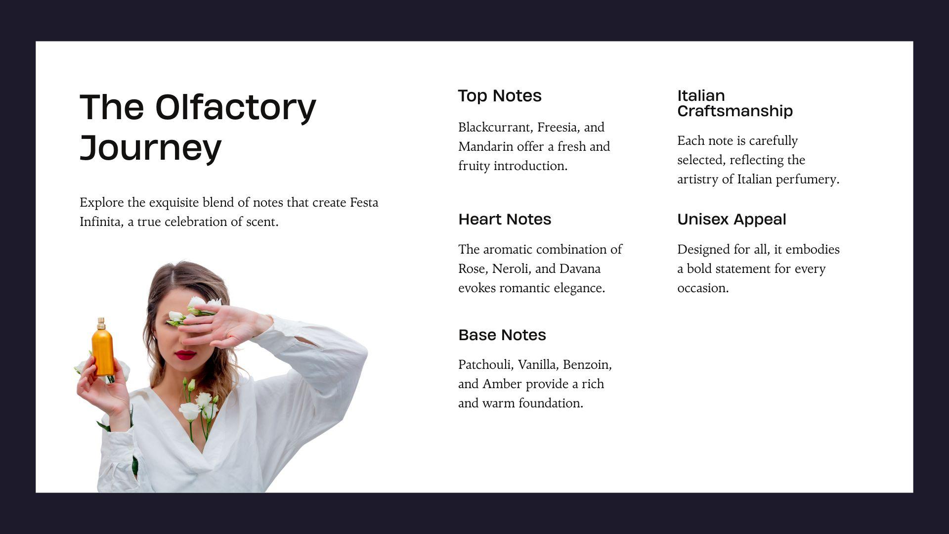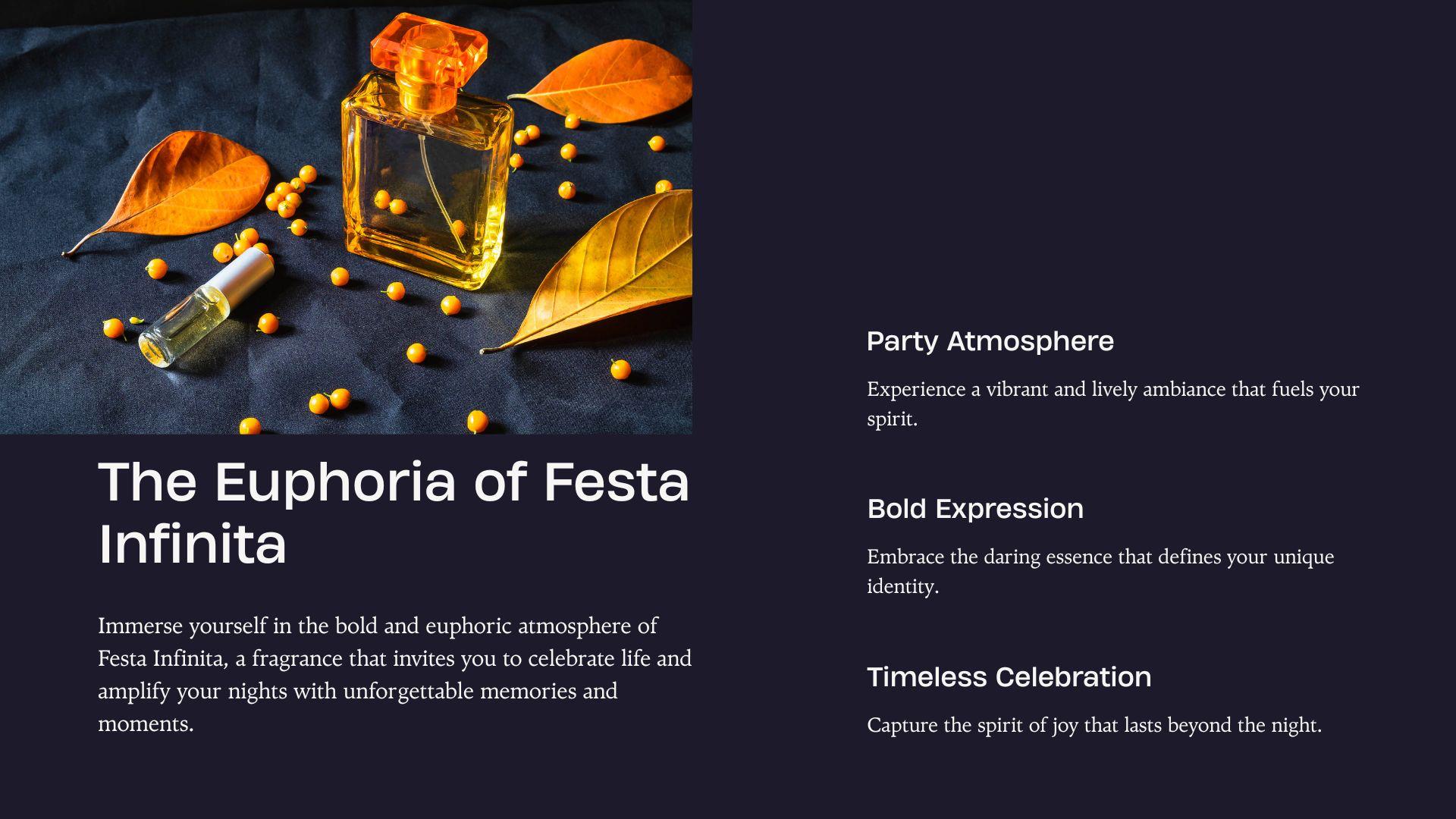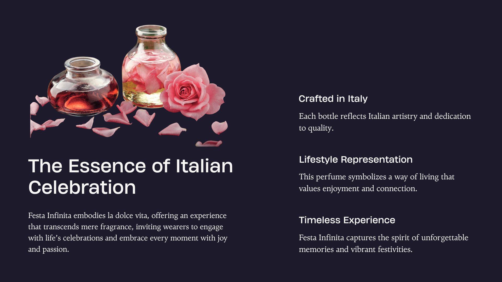 Festa Infinita is inspired by the soul of Italy — a land where life is an art, beauty is worshipped, and every night holds the promise of magic. From the rooftops of Rome to coastal villas in Capri, this fragrance was born from that infectious spirit of la dolce vita. It's a tribute to the people who dance without hesitation, love without rules, and live like the party will never end.