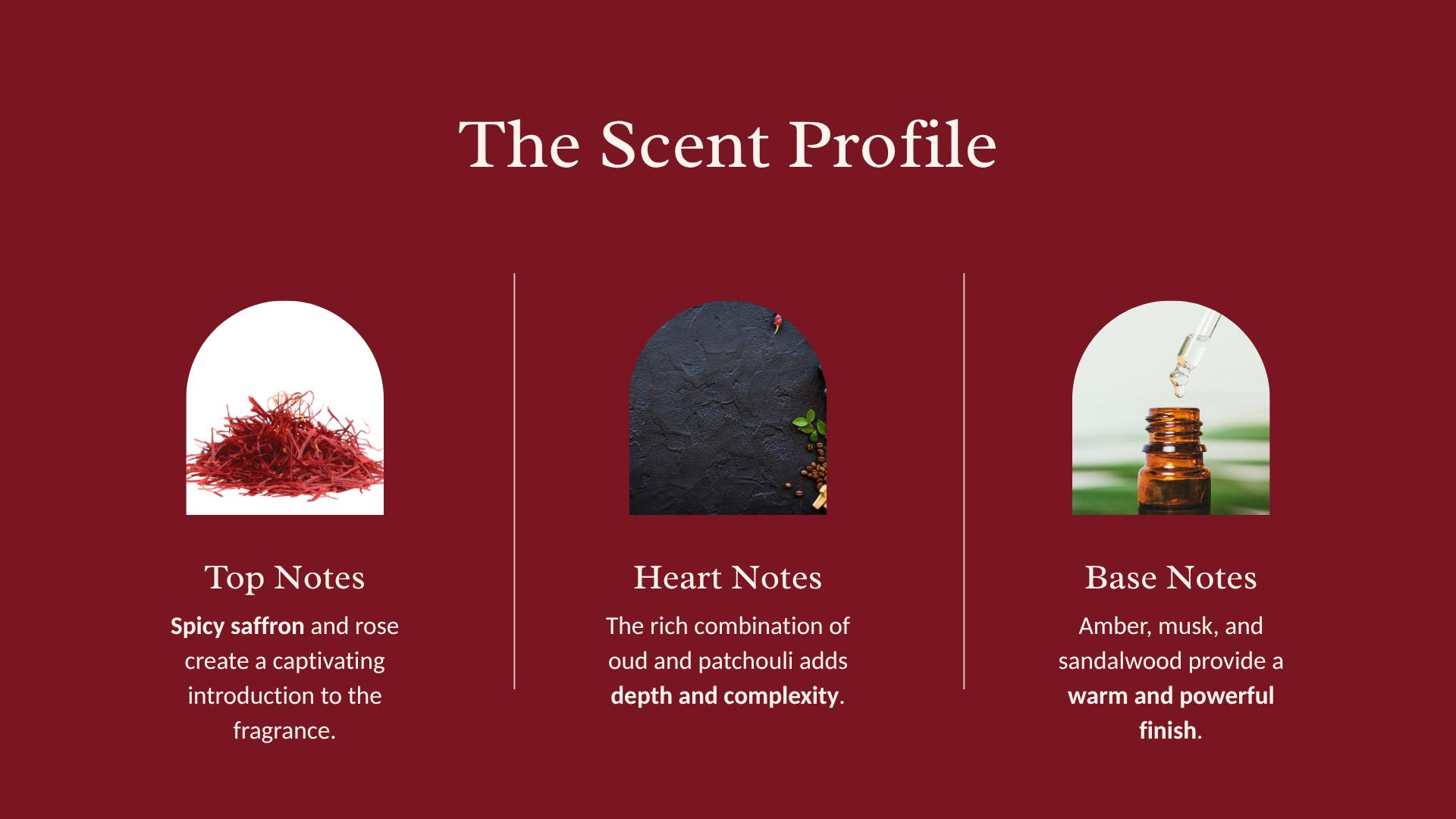 The fragrance opens with the regal warmth of spicy saffron and velvety rose, evoking the scent of royal palaces draped in silk and gold. At the heart lies the majestic duo of Oud and Patchouli, delivering smoky depth, spiritual richness, and ancestral power. Finally, the base unfolds with luxurious amber, sensual musk, and creamy sandalwood, leaving a trail that is both commanding and unforgettable.