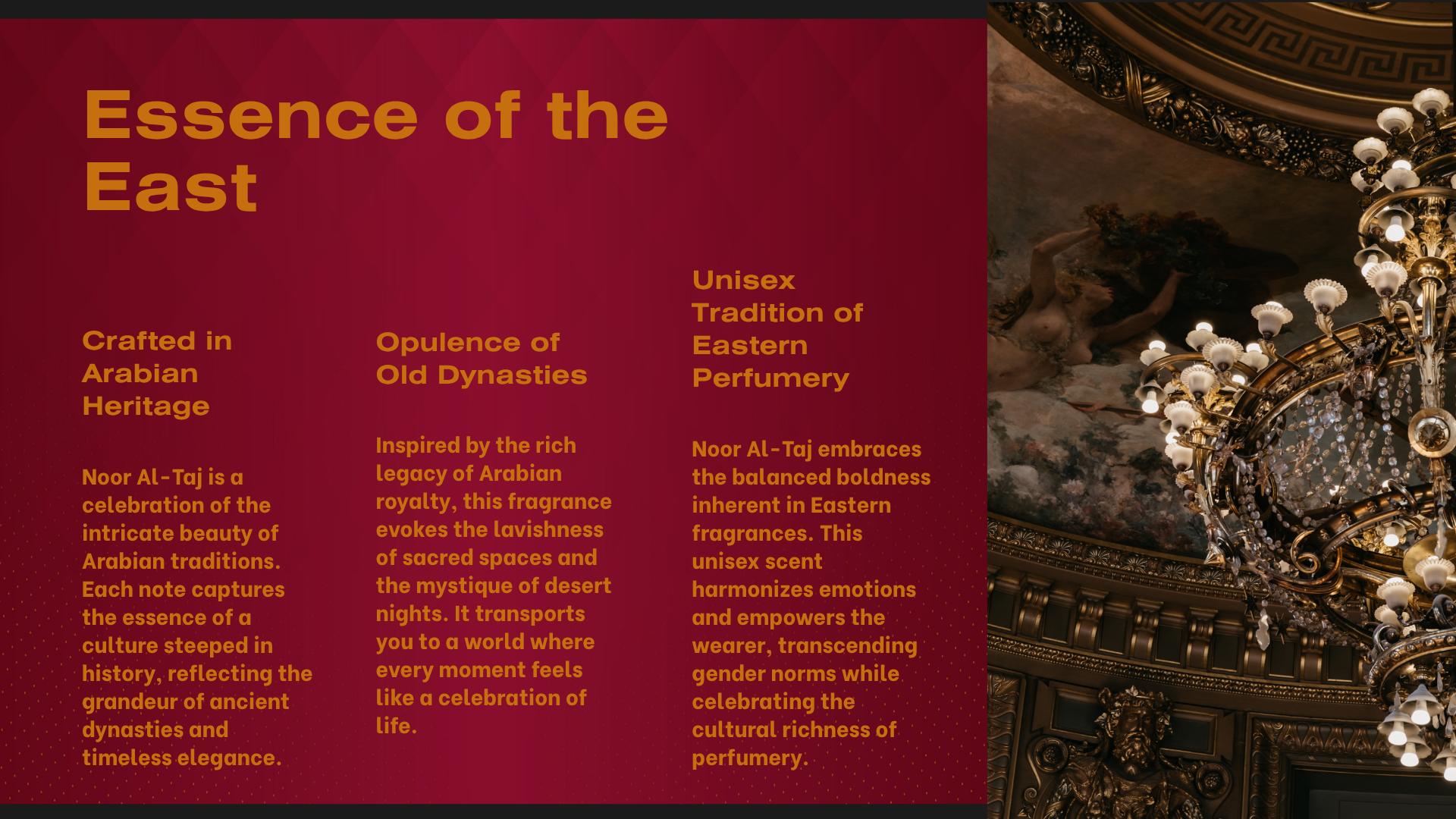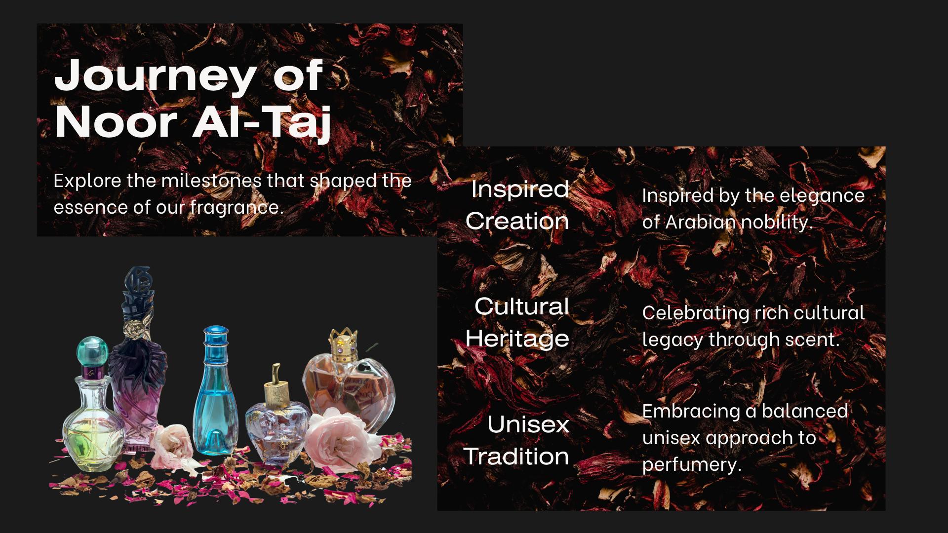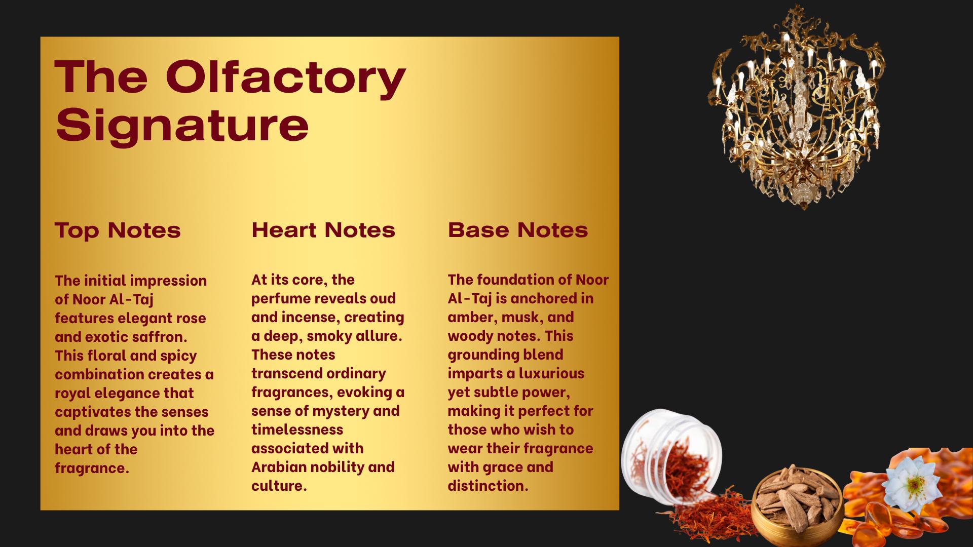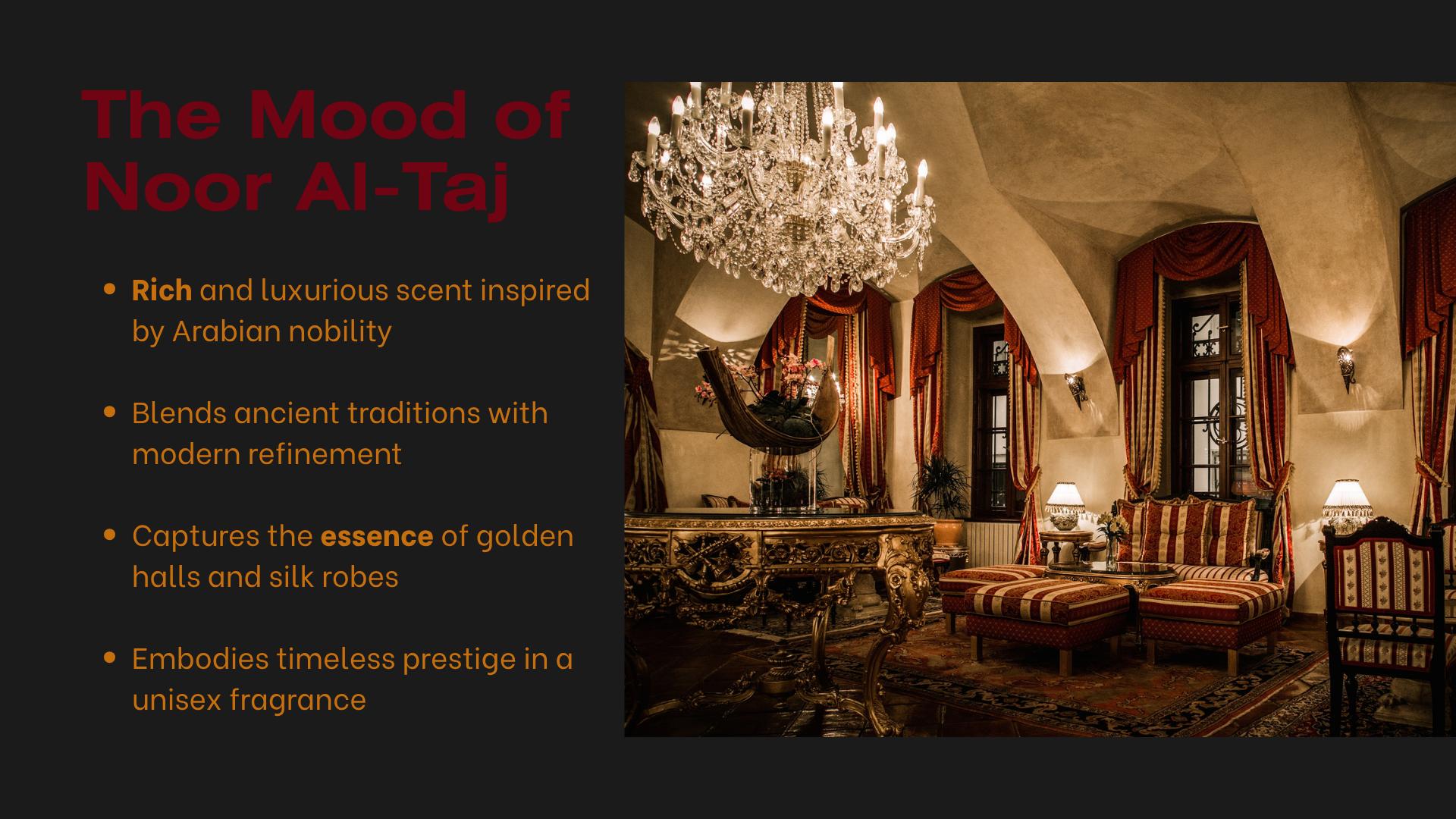 Noor Al-Taj was inspired by the timeless elegance of Arabian royalty — the silken robes, the desert palaces, the legacy of oud-filled chambers and sacred rituals. It’s a modern homage to ancient heritage, blending the spiritual with the sensual. This scent was crafted for those who command attention not through volume, but through presence — and who wear their history like a crown of light.