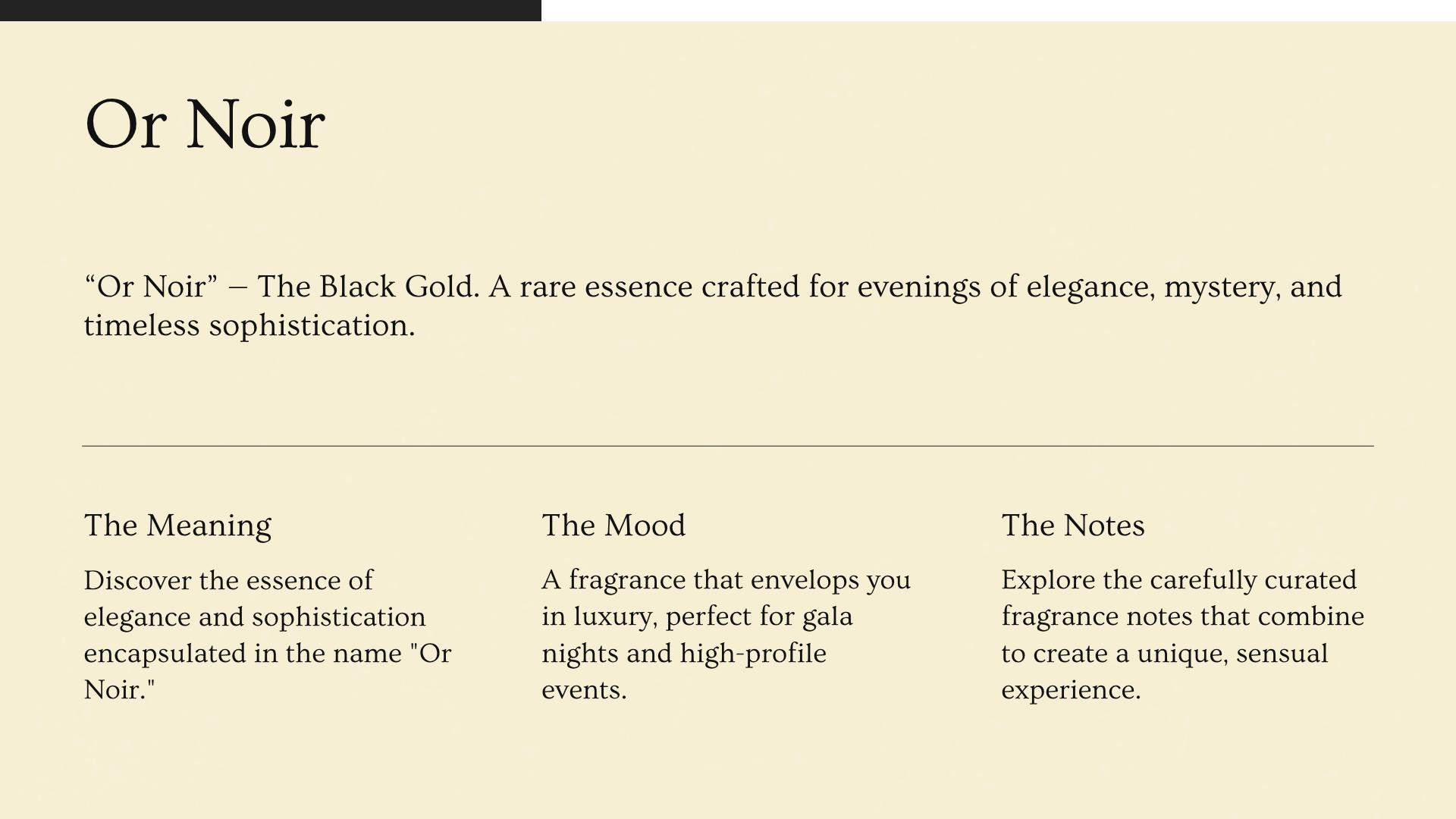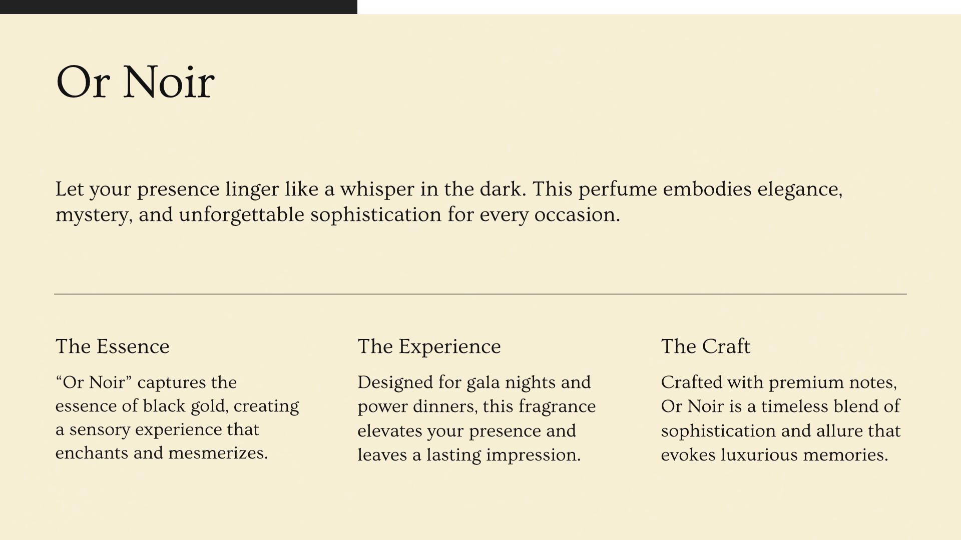Or Noir embodies the essence of refined masculinity and timeless elegance inspired by the art of French perfumery. Designed for the discerning gentleman who commands respect with quiet confidence, this fragrance is perfect for formal occasions where sophistication is paramount.