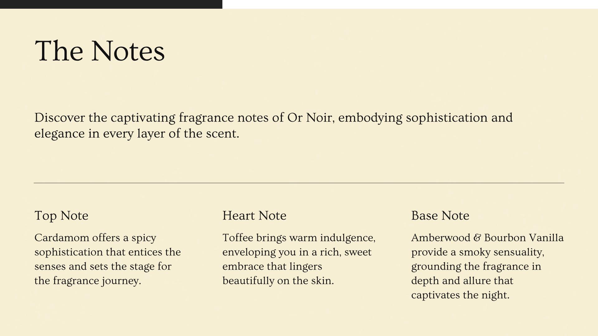 The scent opens with a warm and spicy burst of cardamom, setting a poised and inviting tone. At its heart, rich toffee adds a luxurious sweetness that deepens the aroma with indulgent complexity. The base is anchored by smooth, resinous amberwood and creamy Bourbon vanilla, creating a lasting impression of warmth, depth, and understated power.