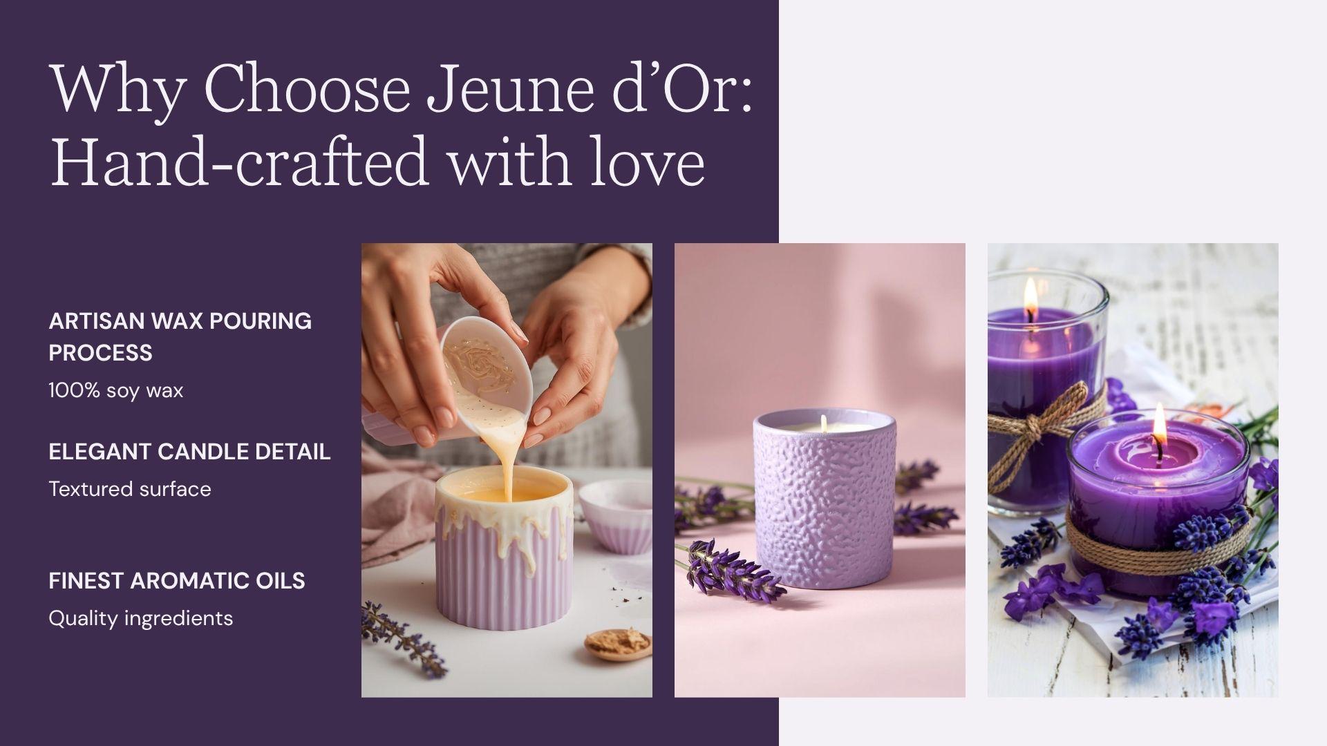 | Behind the Candle | Inspired by the lavender fields bathed in golden sunlight, Amethyst Calm by Jeune d’Or brings the soul-soothing scent of lavender to your sanctuary. Each flame carries tranquility — easing the mind, calming the senses, and wrapping you in the embrace of quiet serenity. |